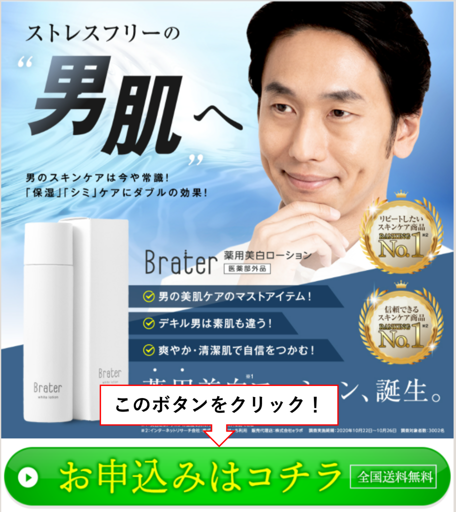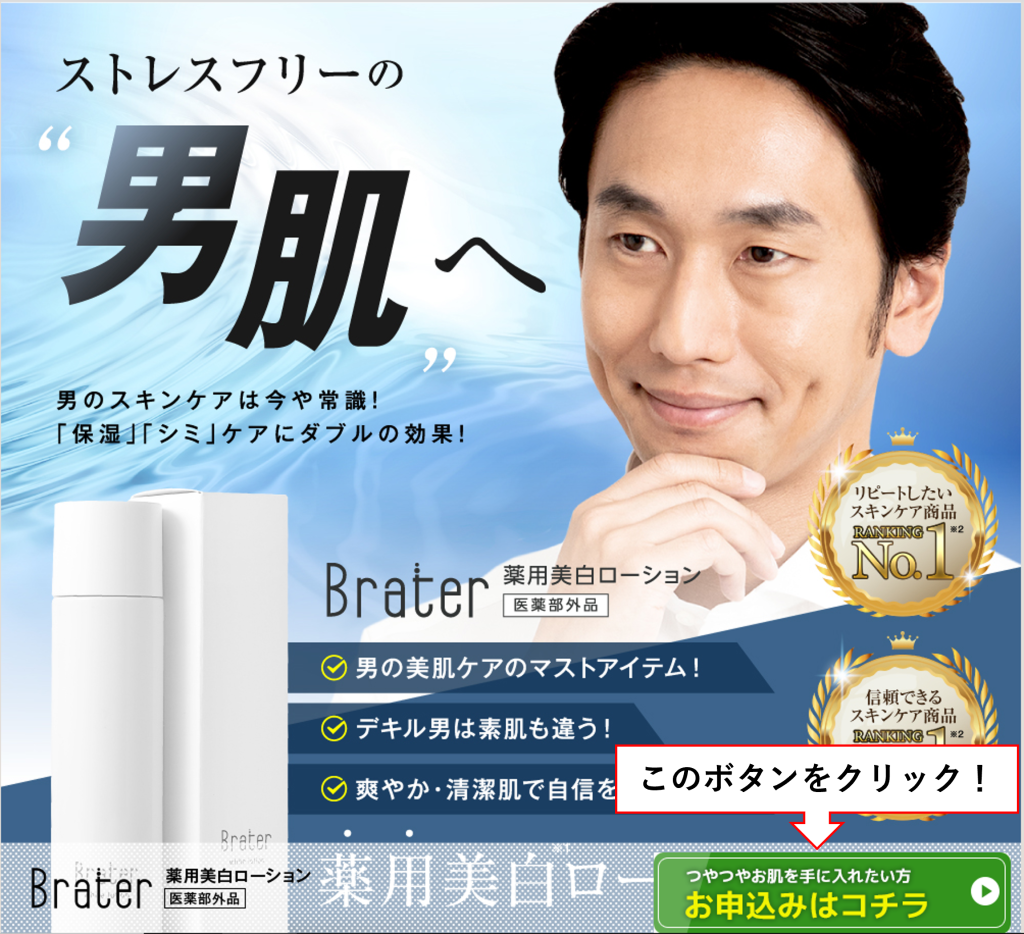 まずは、下記のボタンから Brater薬用美白ローション(男性用) の公式サイトへジャンプしましょう。