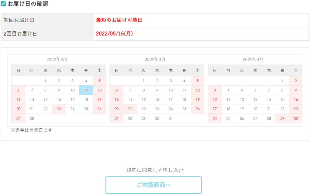 さいごに、お届け日の確認をして「ご確認画面へ」ボタンをクリックします。